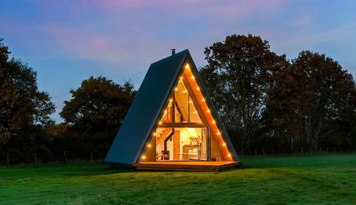 In a private enclosed field, this A frame cabin has a hammock on deck, big patio doors and a wood burner for the evening