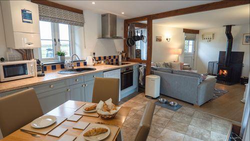 A stunning cottage surrounded by patchwork fields and pockets of woodland on Dux Farm – it’s not just beautiful scenery here – you can wander the 23 acres on site on a circular walk with the dog, stretching your legs together before you’ve even had breakfast (not mandatory for you late risers). A short drive can take you to Sandymouth, Widemouth, Bude, or to any of the smaller coves that litter the coast all the way to Tintagel – offering sandy sprints and coastal walks to get the four-legged friends exercised for the day. Or inland, you can head to the local market towns to explore. At your space, you’ve a modern kitchen to prepare any local ingredients you manage to pick up on your adventures, a comfy L-shape sofa for afternoon naps together by the crackling wood burner, even a bathtub for the two legged and an outdoor wash station for the four!