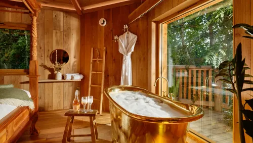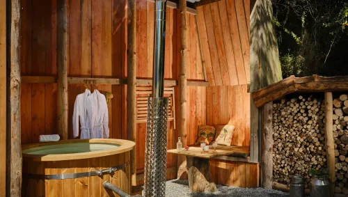 It’s easy to spend too long marvelling at the beauty of The Nest treehouse, you may well be distracted by everything else on offer. The gold bath in the bedroom, the outdoor bath on the terrace, super king-size bed, wood burner and underfloor heating make it tempting never to even venture outdoors, but once your four-legged friend makes a bathroom request, you’ll struggle to head back inside. Once you’ve taken the dog for a stroll of the 20 acres on site, you’ll spot your private courtyard – complete with your wood-fired hot tub, the pizza oven, the outdoor stove and the double hammock for day’s end. If you make use of the North Devon AONB to its fullest, and take some days out, come back, freshen up in the wet room, and collapse in front of the movie projector for the full relaxing effect of The Nest.